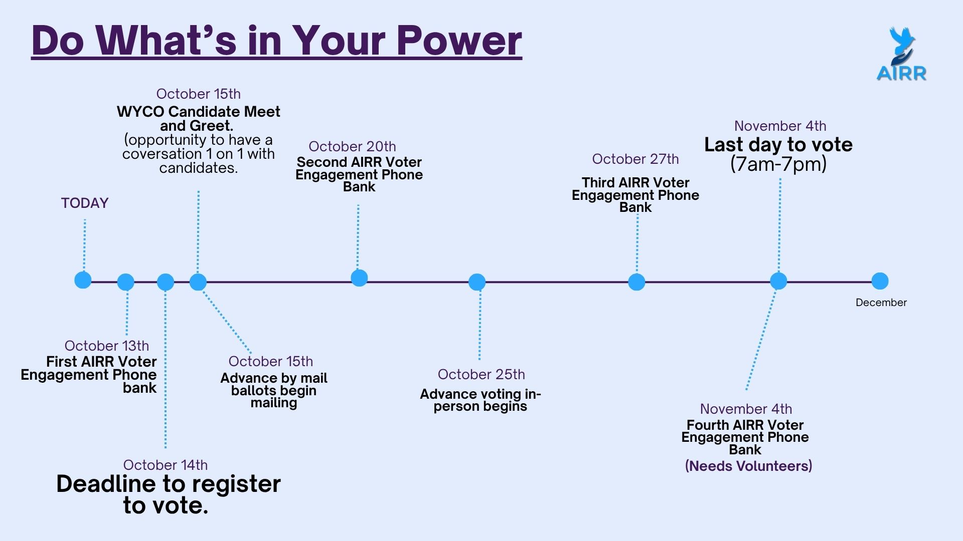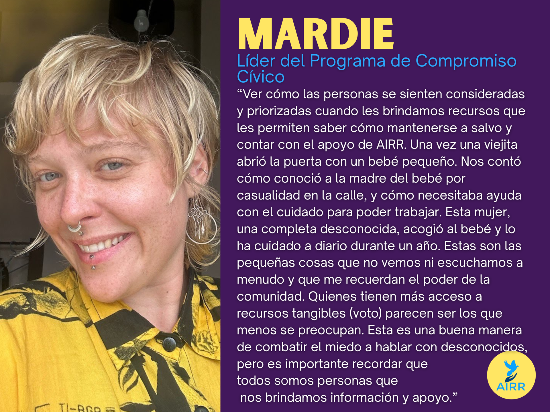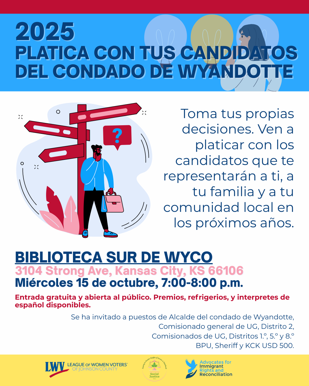 Este año, se celebran las elecciones del condado de Wyandotte. ¡UNAS ELECCIONES IMPORTANTES! y AIRR realizara campañas de información de puerta a puerta en todo el condado de Wyandotte para garantizar que los residentes tengan acceso a información precisa e imparcial sobre cómo y cuándo votar. Si bien las elecciones locales pueden no recibir tanta atención como las nacionales, afectan directamente nuestra vida cotidiana, desde las escuelas y las carreteras locales hasta la vivienda, la policía y la salud pública. Por eso es tan importante votar en las elecciones locales de 2025 del condado de Wyandotte. Entendemos que navegar por las elecciones puede resultar abrumador, especialmente con las reglas cambiantes y los procesos confusos. Pero estamos aquí para ayudar. Cada voto contribuye a forjar el futuro de nuestra comunidad. A continuación, en nuestra sección titulada "El Equipo", encontrará más información sobre cómo apoyar estas iniciativas.